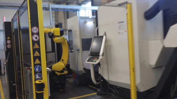 机床操作人员也因此得到高效辅助,尤其是在工件上下料环节。目前公司已有两台五轴加工机床配备机器人工件搬运系统,车铣复合加工中心亦搭载了机器人全自动上料单元。