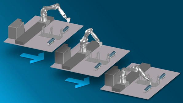 机器人可沿安全刀路(中间)在加工位置(左侧和右侧)之间智能移动