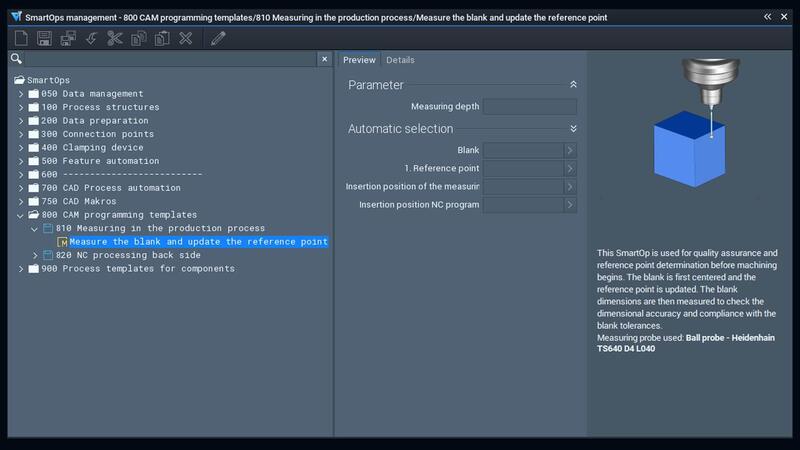 SmartOps(超级模板) 支持高度自定义:例如,可将单个功能单独智能化,或将多个功能组合成功能强大的集成模块。从导入CAD数据、测量毛坯、定位夹具,到选择材料设备、设置测量点,再到创建测量路径并生成CAM程序——一系列典型流程步骤均可被智能关联与高效执行,即便是经验较少的用户也能轻松掌控。总体而言,Tebis 的全套功能模块均适用于SmartOps技术。