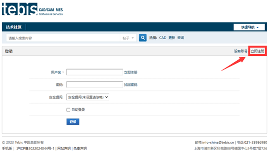 步骤二:进入Tebis中国社区登录页面,新用户点击右上角【立即注册】,老用户输入用户名和密码即可登录。