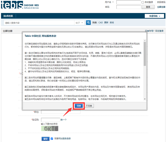 步骤三:阅读并选择【同意】Tebis中国社区网站服务条款。